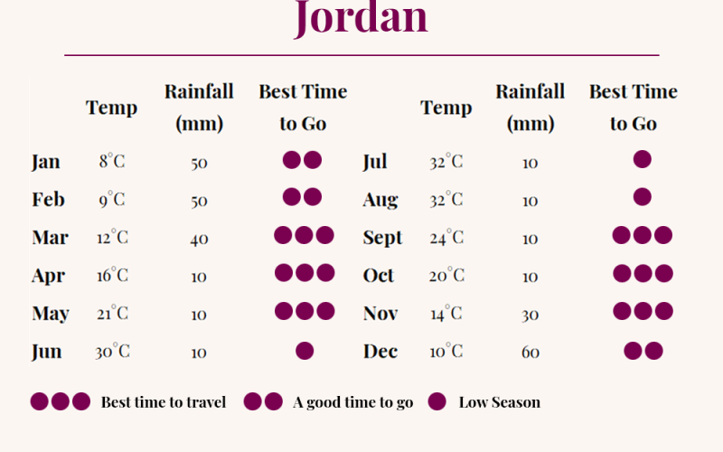The best time to travel to Jordan is March through to May, and September through to November. During these months the temperatures are most pleasant, with warm days and cool nights. As expected summer can be extremely hot, though this is a good time to travel if you want to avoid the crowds! Winter in Jordan can be cold, especially the nights in the desert. Snow fall in certain areas (including Petra) is not unheard of.
